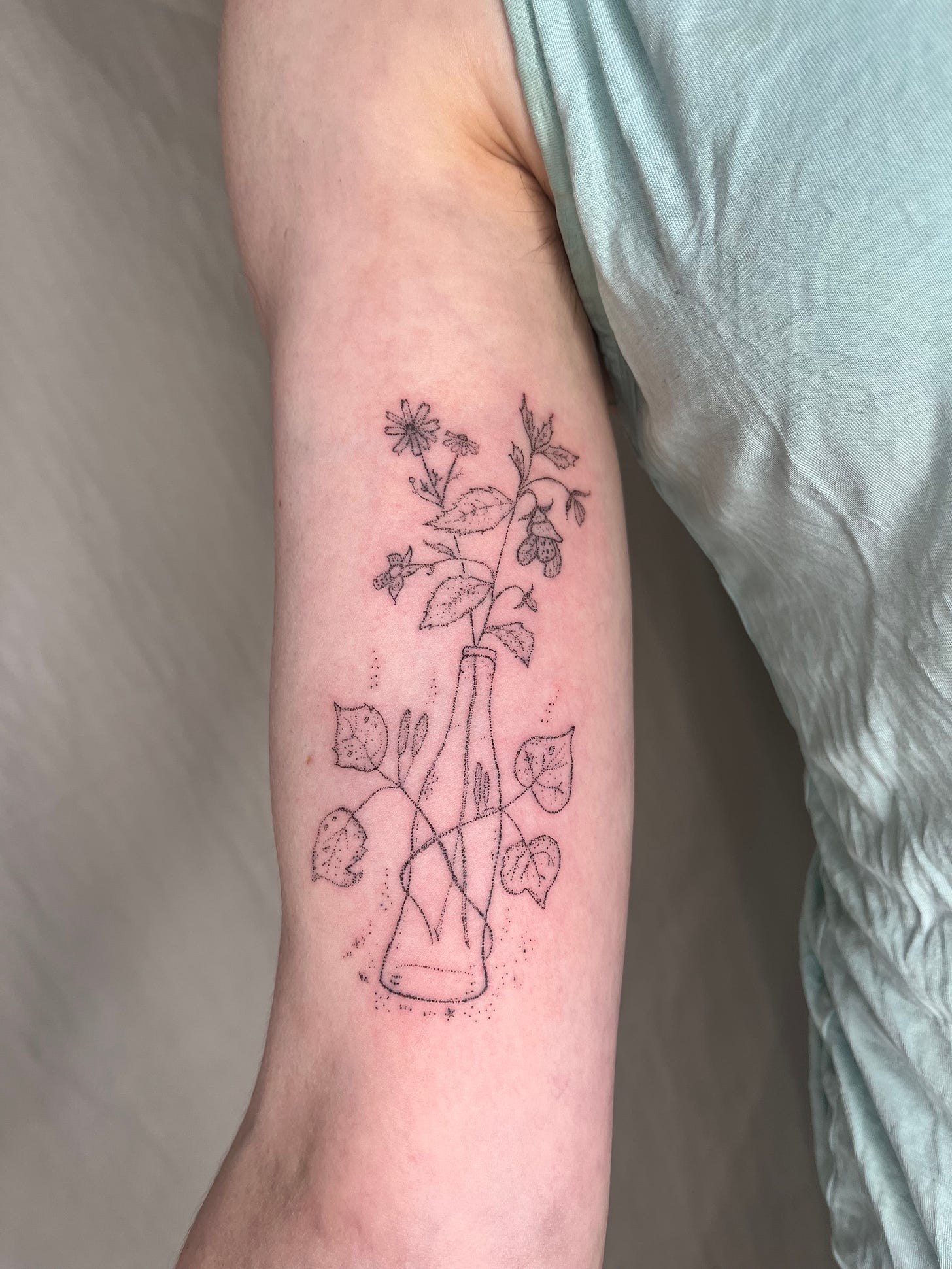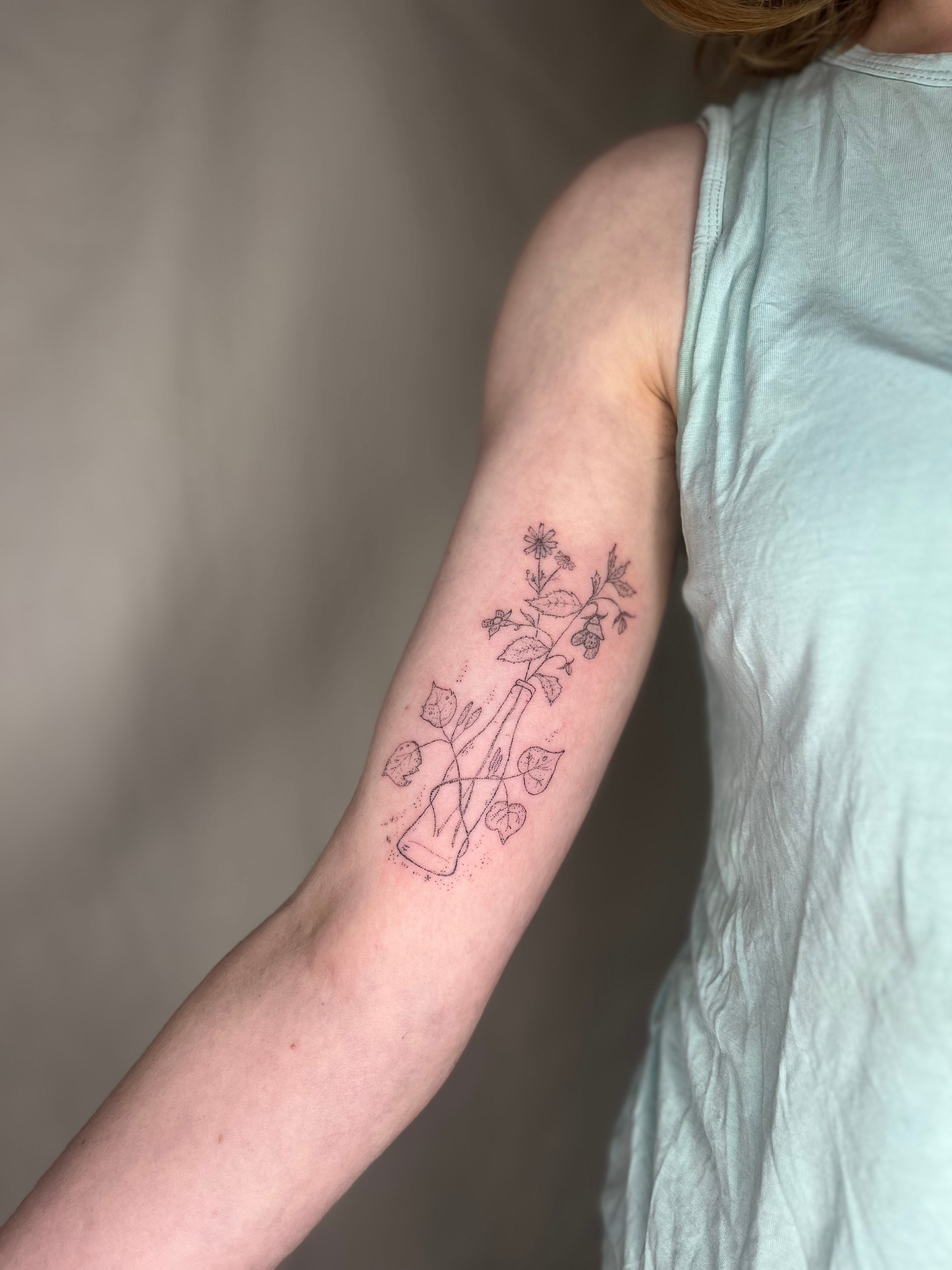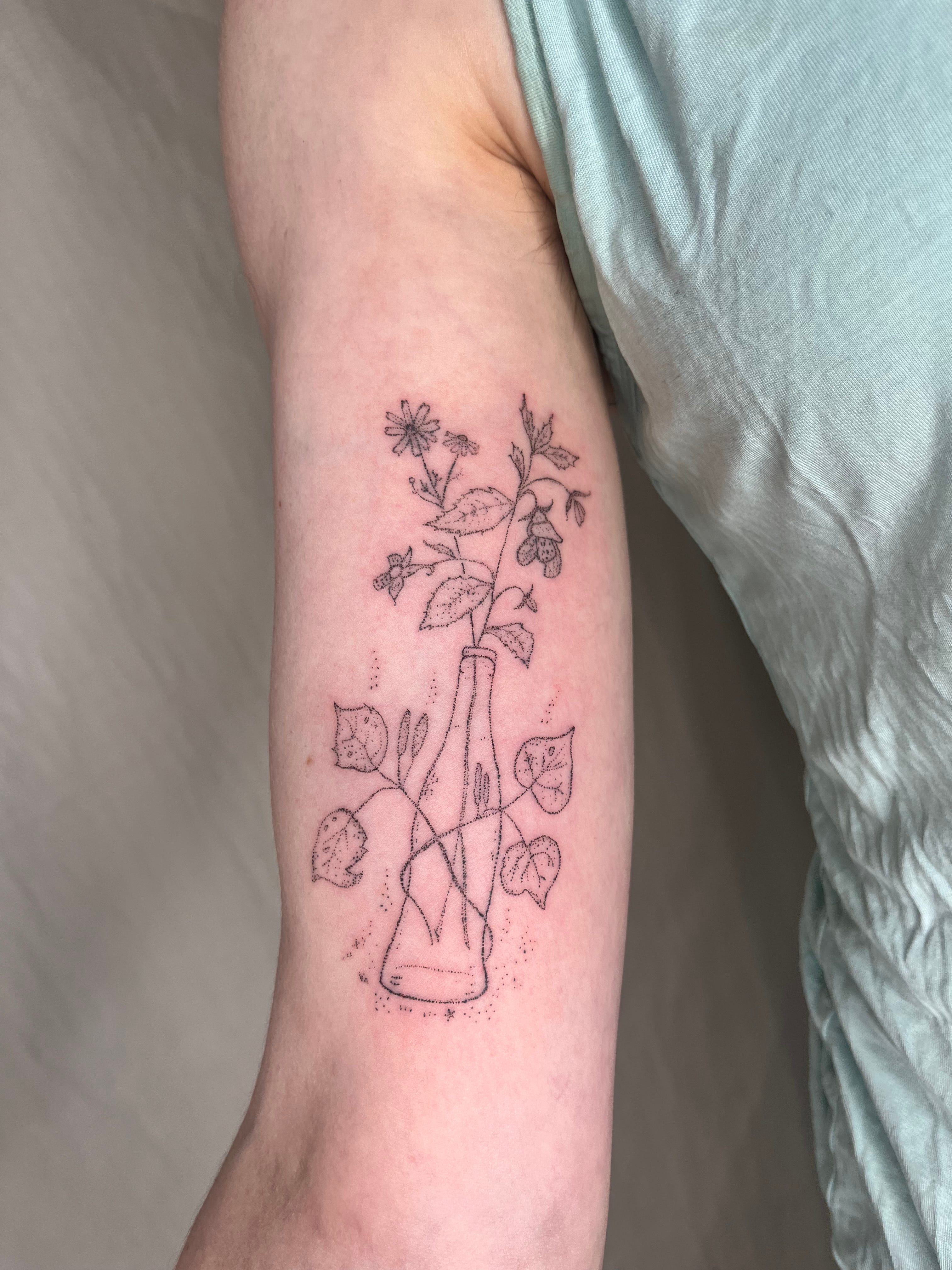 here’s a custom bottle with kawakawa leaves wrapped around it with jewelweed and some daisies coming out the top! this piece was very fun and we intentionally left some bits a little lighter to give a nice fading effect <3